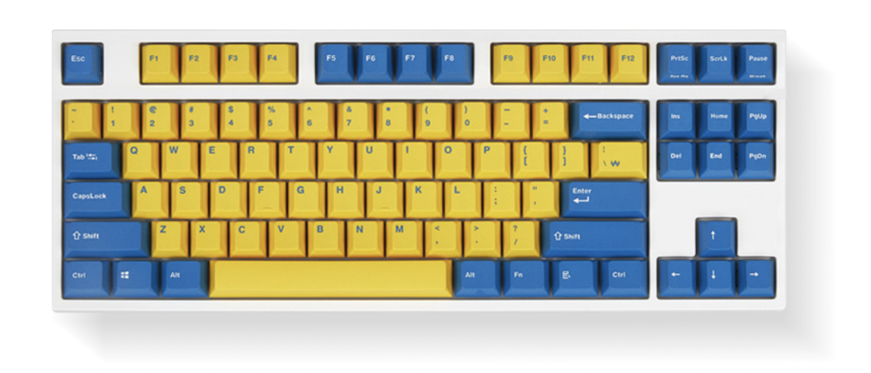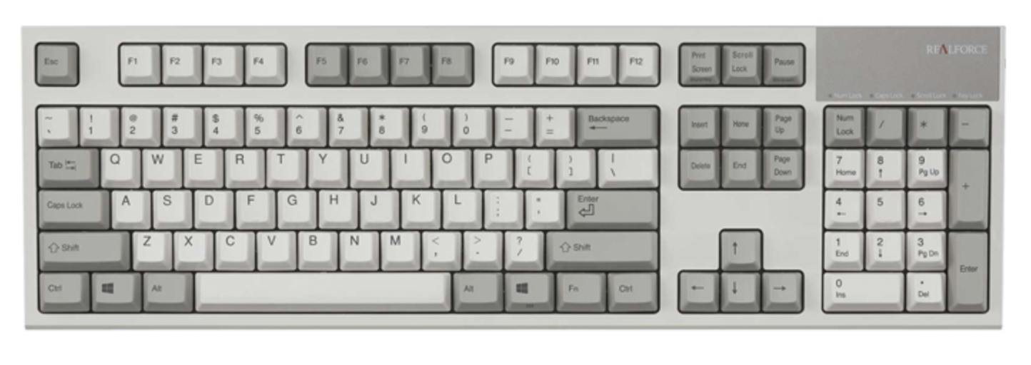 (레이아웃 - 키보드 키의 배치 형태에 따라, 풀 배열, 텐키리스 (오른쪽 숫자키 없는), 미니 등으로 나누어지기도 한다.)